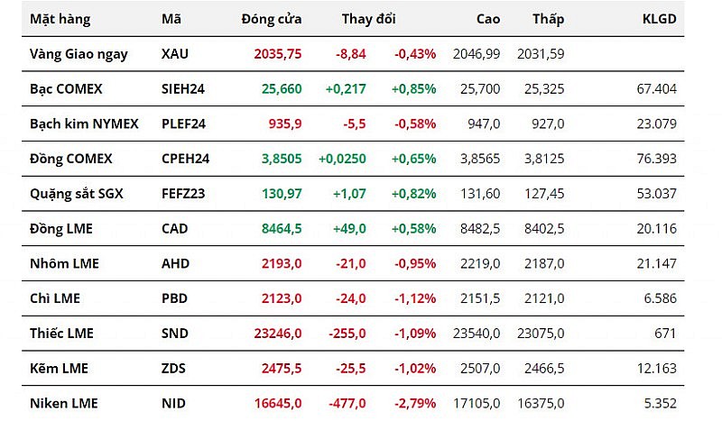 Đối với kim loại cơ bản, giá đồng COMEX phục hồi 0,65% lên 3,85 USD/pound. Giá quặng sắt cũng tăng 0,82%, chốt phiên tại mức 130,97 USD/tấn. Giá cả hai mặt hàng đều được hỗ trợ sau khi Trung Quốc công bố số liệu kinh tế tiêu cực, làm tăng kỳ vọng Chính phủ nước này sẽ tiếp tục ban hành chính sách vực dậy nền kinh tế.
