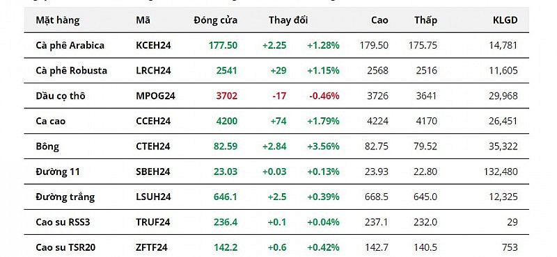 Ở chiều ngược lại, giá bông tăng vọt 3,56% và chạm giới hạn phiên khi số liệu xuất khẩu bông tại Mỹ hồi phục trong báo cáo mới nhất.