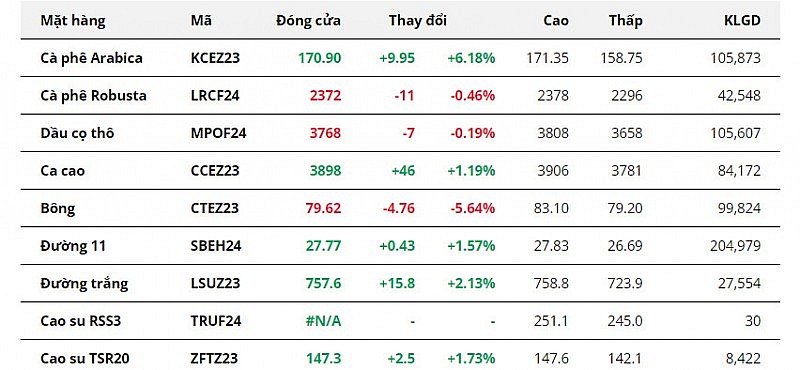 Ở chiều ngược lại, giá bông dẫn đầu đà giảm của nhóm khi đánh mất gần 6% so với tham chiếu. Dữ liệu bán hàng và xuất khẩu bông của Mỹ tích cực trở lại đã lu mờ đi lo ngại nhu cầu bông ở mức thấp.