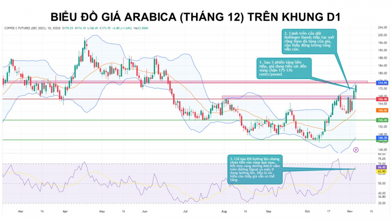 Nhận định: Nếu vượt được kháng cự vùng 175-176 cents/pound thì giá Arabica có thể hướng lên tầm 177,5 cents/pound. Ngược lại, nếu mức chặn quá cứng, giá khả năng cao sẽ điều chỉnh về khoảng 172 cents/pound.