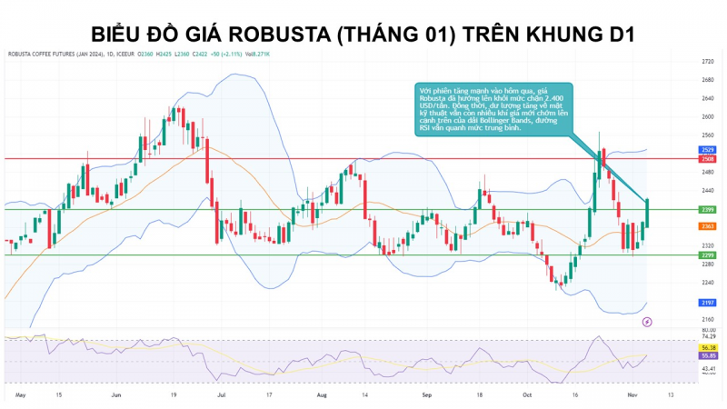 Nhận định: Giá Robusta có thể tăng lên 2.445 USD/tấn nếu giá Arabica còn tăng, trái lại, giá cũng có thể quay về kiểm tra lại độ mạnh của mức chặn 2.400 USD/tấn.