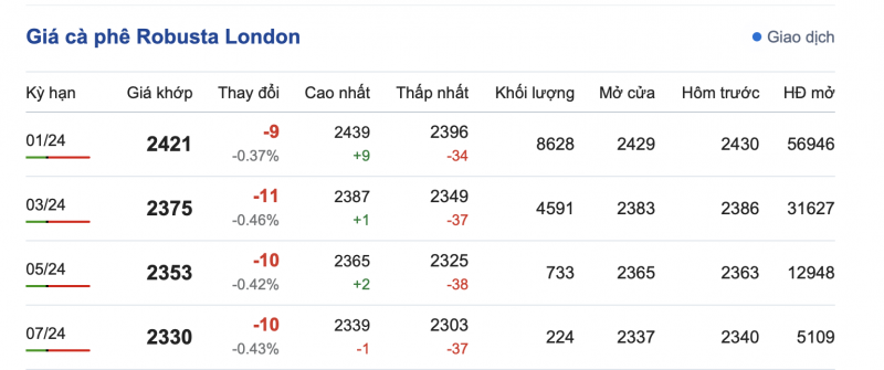 Kết thúc phiên giao dịch, giá cà phê Robusta trên sàn London ngày 11/11/2023 đảo chiều giảm, dao động từ 2.303 - 2.439 USD/tấn. Cụ thể, kỳ hạn giao hàng tháng 1/2024 là 2.421 USD/tấn (giảm 9 USD/tấn); kỳ hạn giao hàng tháng 3/2024 là 2.375 USD/tấn (giảm 11 USD/tấn); kỳ hạn giao hàng tháng 5/2024 là 2.353 USD/tấn (tăng 10 USD/tấn) và kỳ hạn giao hàng tháng 7/2024 là 2.330 USD/tấn (tăng 10 USD/tấn).