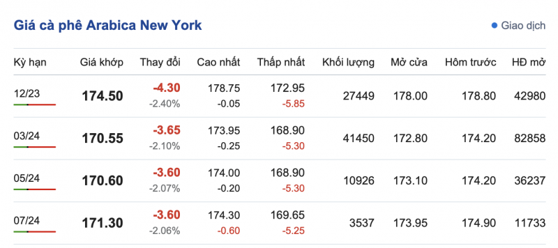 Tương tự, giá cà phê Arabica trên sàn New York sáng ngày 11/11 cũng bất ngờ đảo chiều giảm ở tất cả các kỳ hạn, mức giảm cao nhất l5,25 cent/lb. Cụ thể, kỳ hạn giao hàng tháng 12/2023 là 174,50 cent/lb (giảm 4,30 cent/lb); kỳ giao hàng tháng 3/2024 là 170,55 cent/lb (giảm 3,65 cent/lb); kỳ giao hàng tháng 5/2024 là 170,60 cent/lb và kỳ giao hàng tháng 7/2024 là 171,30 cent/lb.