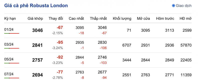 Cụ thể, giá cà phê Robusta trên sàn London ngày 1/1/2024 vẫn duy trì mức giá giảm sâu tại các kỳ hạn, lên tới 95 USD/kg, dao động từ 2.694 - 3.046 USD/tấn. Cụ thể, kỳ hạn giao hàng tháng 1/2024 là 3.046 USD/tấn; kỳ hạn giao hàng tháng 3/2024 là 2.841 USD/tấn; kỳ hạn giao hàng tháng 5/2024 là 2.757 USD/tấn và kỳ hạn giao hàng tháng 7/2024 là 2.694 USD/tấn.