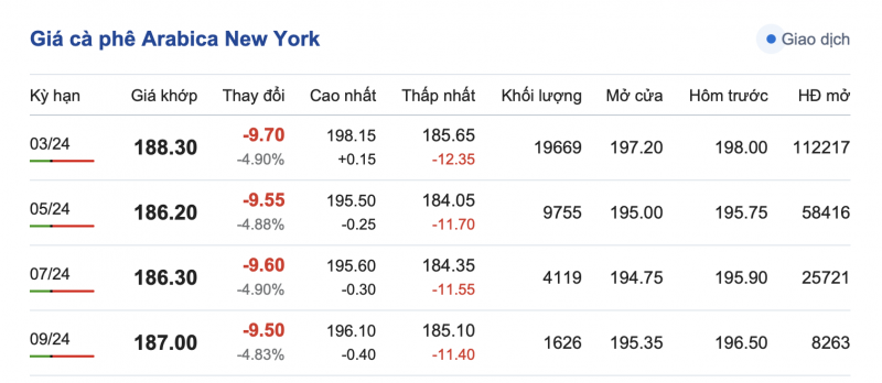 Tương tự, giá cà phê Arabica trên sàn New York ngày 1/1/2024 tiếp tục giảm. Cụ thể, kỳ hạn giao hàng tháng 3/2024 là 188,30 cent/lb (giảm 4,90%%); kỳ giao hàng tháng 5/2024 là 186,20ent/lb (giảm 4,88%); kỳ giao hàng tháng 7/2024 là 186,30 cent/lb (giảm 4,90%%) và kỳ giao hàng tháng 9/2024 là 187,0 cent/lb (giảm 4,83%).