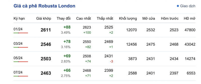 Giá cà phê Robusta trên sàn London ngày 1/12/2023 đảo chiều tăng trở lại, mức tăng cao nhất là 88 USD/tấn, dao động từ 2,399 - 2,623 USD/tấn. Cụ thể, kỳ hạn giao hàng tháng 1/2024 là 2,611 USD/tấn (tăng 88 USD/tấn); kỳ hạn giao hàng tháng 3/2024 là 2,546 USD/tấn (tăng 78 USD/tấn); kỳ hạn giao hàng tháng 5/2024 là 2,503 USD/tấn (tăng 69 USD/tấn) và kỳ hạn giao hàng tháng 7/2024 là 2,463 USD/tấn (tăng 66 USD/tấn).