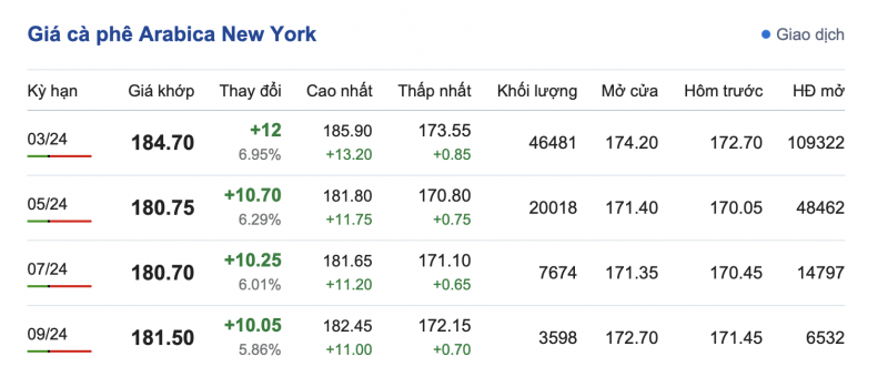 Tương tự, giá cà phê Arabica trên sàn New York sáng ngày 1/12 cũng đảo chiều tăng. Cụ thể, mức tăng từ 0,70cent/lb- 13,20 cent/lb. Cụ thể, kỳ hạn giao hàng tháng 3/2024 là 184,70 cent/lb; kỳ giao hàng tháng 5/2024 là 180,75 cent/lb; kỳ giao hàng tháng 7/2024 là 170,70 cent/lb và kỳ giao hàng tháng 9/2024 là 181,50 cent/lb.
