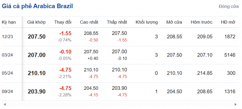 Giá cà phê Arabica Brazil sáng ngày 12/11/2023 cũng giảm nhưng nhẹ tùy thời điểm. Cụ thể, kỳ hạn giao hàng tháng 12/2023 là 207,50 USD/tấn (giảm 1,55 USD/tấn); giao hàng tháng 3/2024 là 207,00 USD/tấn; giao hàng tháng 5/2024 là 210,10 (giảm 4,75 USD/tấn) và giao hàng tháng 9/2024 là 203,90 USD/tấn (giảm 4,75 USD/tấn).