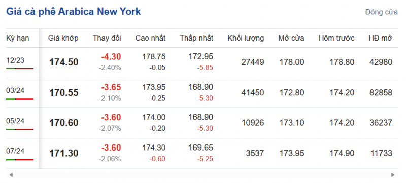 Tương tự, giá cà phê Arabica trên sàn New York sáng ngày 12/11 cũng bất ngờ đảo chiều giảm ở tất cả các kỳ hạn, mức giảm cao nhất 4,30 cent/lb. Cụ thể, kỳ hạn giao hàng tháng 12/2023 là 174,50 cent/lb (giảm 4,30 cent/lb); kỳ giao hàng tháng 3/2024 là 170,55 cent/lb (giảm 3,65 cent/lb); kỳ giao hàng tháng 5/2024 là 170,60 cent/lb và kỳ giao hàng tháng 7/2024 là 171,30 cent/lb.