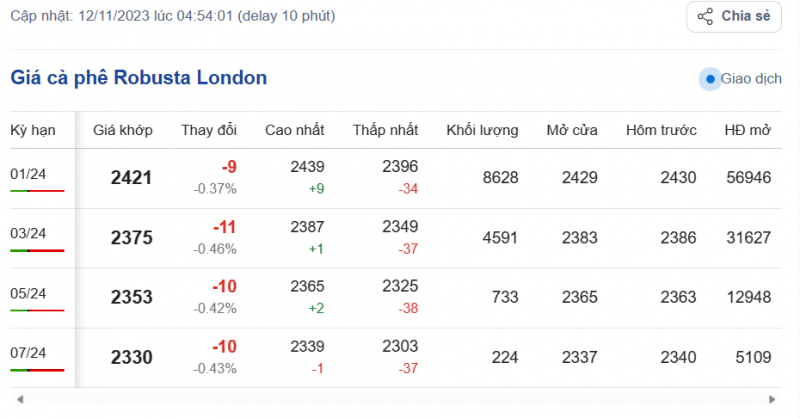 Kết thúc phiên giao dịch, giá cà phê Robusta trên sàn London ngày 12/11/2023 đảo chiều giảm, dao động từ 2.330 - 2.421USD/tấn. Cụ thể, kỳ hạn giao hàng tháng 1/2024 là 2.421 USD/tấn (giảm 9 USD/tấn); kỳ hạn giao hàng tháng 3/2024 là 2.375 USD/tấn (giảm 11 USD/tấn); kỳ hạn giao hàng tháng 5/2024 là 2.353 USD/tấn (tăng 10 USD/tấn) và kỳ hạn giao hàng tháng 7/2024 là 2.330 USD/tấn (tăng 10 USD/tấn).