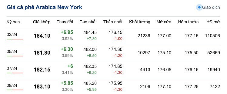 Tương tự, giá cà phê Arabica trên sàn New York sáng ngày 12/12 có xu hướng ổn định và tăng, mức tăng trên 3% so với phiên giao dịch trước đó. Cụ thể, kỳ hạn giao hàng tháng 3/2024 là 184,10 cent/lb (tăng 3,92%); kỳ giao hàng tháng 5/2024 là 181,80 cent/lb (tăng 3,59%); kỳ giao hàng tháng 7/2024 là 182,15 cent/lb (tăng 3,41%) và kỳ giao hàng tháng 9/2024 là 183,10 cent/lb (tăng 3,30%).