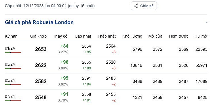 Giá cà phê Robusta trên sàn London ngày 12/12/2023 tiếp tục tăng mạnh so với phiên giao dịch trước đó, mức tăng từ 84 - 96 USD/tấn, dao động từ 2.455 - 2.664 USD/tấn. Cụ thể, kỳ hạn giao hàng tháng 1/2024 là 2.653 USD/tấn (tăng 84 USD/tấn); kỳ hạn giao hàng tháng 3/2024 là 2.622 USD/tấn (tăng 96 USD/tấn); kỳ hạn giao hàng tháng 5/2024 là 2.582 USD/tấn (tăng 95 USD/tấn) và kỳ hạn giao hàng tháng 7/2024 là 2.548 USD/tấn (tăng 91 USD/tấn).