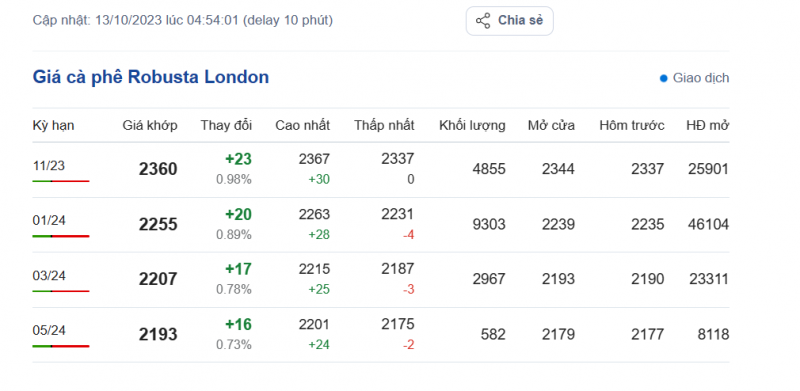 | Giá Arabia và Robusta mới nhất ngày 13/10/2023 |