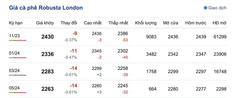 Trên thế giới, kết thúc phiên giao dịch ngày 12/9, giá cà phê Robusta tại London giao tháng 11/2023 giảm 9 USD/tấn, ở mức 2.430 USD/tấn, giao tháng 1/2024 giảm 116 USD/tấn, ở mức 2.336 USD/tấn.