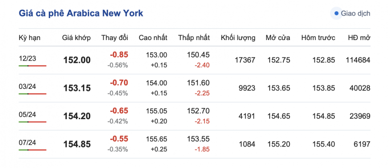 Trên sàn New York, giá cà phê Arabica giao tháng 12/2023 giảm 0,85 cent/lb, ở mức 152 cent/lb, giao tháng 3/2024 giảm 0,7 cent/lb, ở mức 153,15 cent/lb.