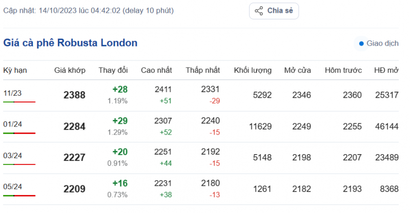 Kết thúc phiên, giá cà phê Robusta trên sàn London ngày 14/10/2023 tăng mạnh, mức tăng đến 29 USD/tấn. Cụ thể, kỳ hạn giao hàng tháng 11/2023 là 2.388 USD/tấn (tăng 28 USD/tấn); kỳ hạn giao hàng tháng 1/2024 là 2.284 USD/tấn (tăng 29 USD/tấn); kỳ hạn giao hàng tháng 3/2024 là 2.227 USD/tấn (tăng 20 USD/tấn) và kỳ hạn giao hàng tháng 5/2024 là 2.209 USD/tấn (tăng 16 USD/tấn).