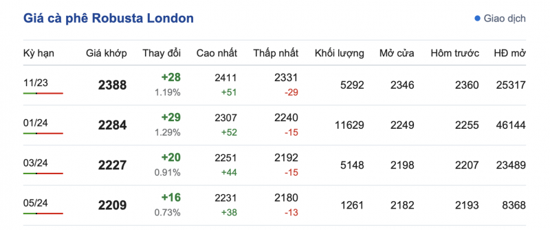 Kết thúc phiên giao dịch cuối tuần, giá cà phê Robusta trên sàn ICE Europe – London nối tiếp đà tăng. Kỳ hạn giao tháng 11 tăng thêm 28 USD, lên 2.388 USD/tấn và kỳ hạn giao tháng 1 tăng 29 USD, lên 2.284 USD/tấn, các mức tăng rất đáng kể. Khối lượng giao dịch khá cao trên mức trung bình.