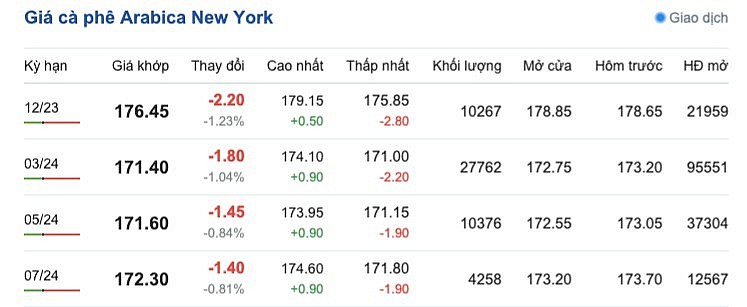 Tương tự, giá cà phê Arabica trên sàn New York sáng ngày 15/11 có xu hướng giảm, mức giảm trên dưới 1% so với phiên giao dịch trước đó, dao động từ 171,00 - 179,15 cent/lb tuỳ từng kỳ hạn giao hàng. Cụ thể, kỳ hạn giao hàng tháng 12/2023 là 176,45 cent/lb (giảm 1,23%); kỳ giao hàng tháng 3/2024 là 171,40 cent/lb (giảm 1,04%); kỳ giao hàng tháng 5/2024 là 171,60 cent/lb (giảm 0,84%) và kỳ giao hàng tháng 7/2024 là 172,30 cent/lb (giảm 0,81).