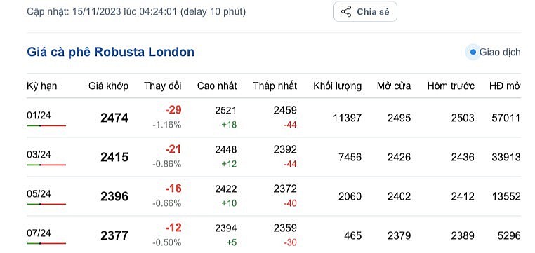 Kết thúc phiên giao dịch, giá cà phê Robusta trên sàn London ngày 15/11/2023 bất ngờ quay đầu giảm, mức giảm từ 12 - 29 USD/tấn, so với phiên giao dịch trước đó, dao động từ 2.359 - 2.521 USD/tấn. Cụ thể, kỳ hạn giao hàng tháng 1/2024 là 2.474 USD/tấn (giảm 29 USD/tấn); kỳ hạn giao hàng tháng 3/2024 là 2.415 USD/tấn (giảm 21 USD/tấn); kỳ hạn giao hàng tháng 5/2024 là 2.396 USD/tấn (giảm 16 USD/tấn) và kỳ hạn giao hàng tháng 7/2024 là 2.377 USD/tấn (giảm 12 USD/tấn).