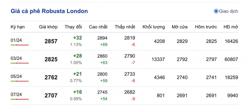 Giá cà phê Robusta trên sàn London ngày 16/12/2023 tăng phiên thứ 6 liên tiếp trong tuần, mức tăng từ 16-69 USD/tấn, dao động từ 2.745 - 2.894 USD/tấn. Cụ thể, kỳ hạn giao hàng tháng 1/2024 là 2.857 USD/tấn (tăng 32 USD/tấn); kỳ hạn giao hàng tháng 3/2024 là 2.825 USD/tấn (tăng 28 USD/tấn); kỳ hạn giao hàng tháng 5/2024 là 2.762 USD/tấn và kỳ hạn giao hàng tháng 7/2024 là 2.707 USD/tấn.