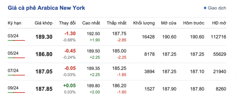 Trái ngược, giá cà phê Arabica trên sàn New York ngày 16/12 sau thời gian 5 phiên có mức tăng liên tục thì tại phiên thứ 6 trong tuần đã có chuyển biến. Cụ thể, có mức giảm ở các kỳ hạn đầu và tăng nhẹ ở kỳ hạn cuối. Kỳ hạn giao hàng tháng 3/2024 là 189,30 cent/lb (giảm 1,30 cent/lb); kỳ giao hàng tháng 5/2024 là 186,80 cent/lb (giảm 0,45 cent/lb); kỳ giao hàng tháng 7/2024 là 187,05 cent/lb (giảm 0,05 cent/lb) và kỳ giao hàng tháng 9/2024 là 187,85 cent/lb (tăng 0,05 cent/lb).