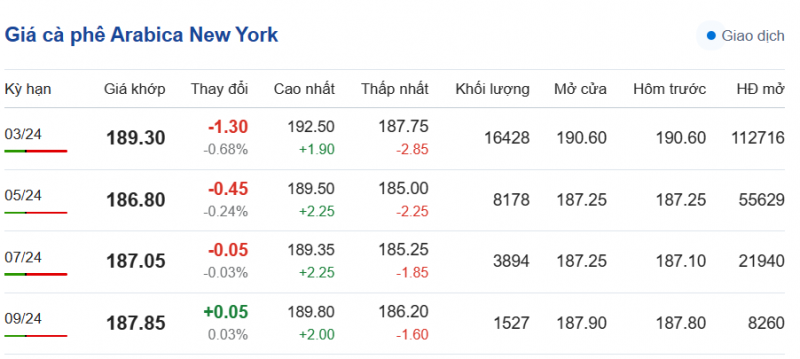 Bên cạnh đó, giá cà phê Arabica trên sàn New York ngày 17/12 trở lại xu hướng hỗn hợp, giảm ở các kỳ hạn gần và tăng ở kỳ hạn xa. Cụ thể, kỳ hạn giao hàng tháng 3/2024 là 189,30 cent/lb (giảm 0,68%); kỳ giao hàng tháng 5/2024 là 186,80 cent/lb (giảm 0,24%); kỳ giao hàng tháng 7/2024 là 187,05cent/lb (giảm 0,03%) và kỳ giao hàng tháng 9/2024 là 186,05 cent/lb (tăng 0,03%).