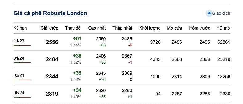Giá cà phê Robusta trên sàn London tiếp nối đà phục hồi tăng, mức tăng từ 34 - 61 USD/tấn, dao động từ 2.486 - 2.560 USD/tấn. Cụ thể, kỳ hạn giao ngay tháng 11/2023 là 2.556 USD/tấn (tăng 61 USD/tấn, tức tăng 2,44%); kỳ hạn giao ngay 1/2024 là 2.404 USD/tấn (tăng 36 USD/tấn, tức tăng 1,52%). Khối lượng giao dịch duy trì trên mức trung bình.