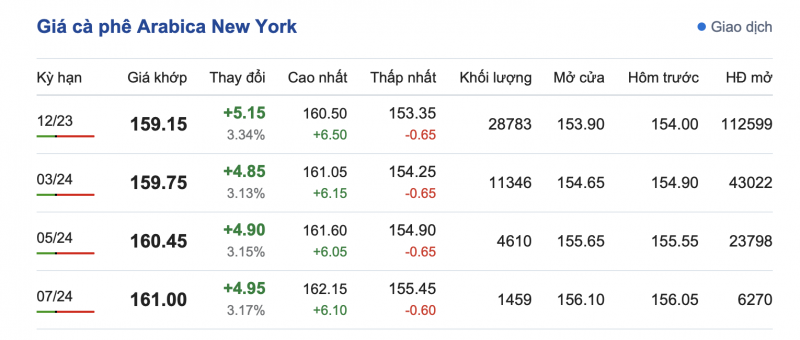 Tương tự như sàn Robusta London, giá cà phê Arabica trên sàn New York cũng tăng mạnh trở lại ở các kỳ giao hàng, mức tăng từ 4,85 - 5,15 cent/lb, dao động từ 153,35 - 162,15 cent/lb. Cụ thể, kỳ hạn giao hàng tháng 12/2023 là 159,15 cent/lb (tăng 5,15 cent/lb, tức tăng 3,34%); kỳ giao hàng kỳ hạn 3/2024 là 159,75 cent/lb (tăng 4,85 cent/lb).