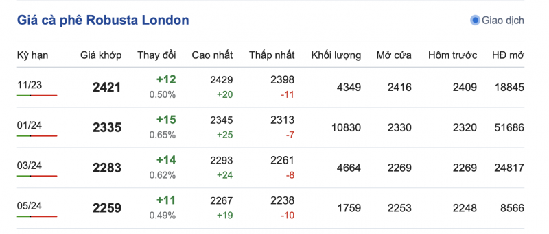 Kết thúc phiên, giá cà phê Robusta trên sàn London ngày 19/10/2023 xu hướng ổn định và tăng liên tiếp phiên thứ sáu. Mức tăng từ 11 - 15 USD, dao động từ 2.259 - 2.421 USD/tấn. Cụ thể, kỳ hạn giao tháng 11 tăng thêm 12 USD, lên 2.421 USD/tấn và kỳ hạn giao tháng 1 tăng thêm 15 USD, lên 2.335 USD/tấn, các mức tăng đáng kể. Khối lượng giao dịch trên mức trung bình.