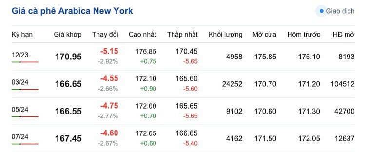 Tương tự, giá cà phê Arabica trên sàn New York sáng ngày 19/11 ổn định, dao động từ 165,60 - 176,85 cent/lb tuỳ từng kỳ hạn giao hàng. Cụ thể, kỳ hạn giao hàng tháng 12/2023 là 170,95 cent/lb; kỳ giao hàng tháng 3/2024 là 166,65 cent/lb; kỳ giao hàng tháng 5/2024 là 166,55 cent/lb và kỳ giao hàng tháng 7/2024 là 167,45 cent/lb.