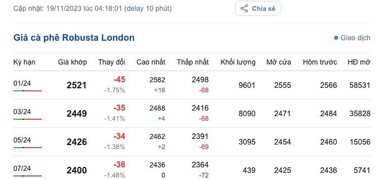 | Giá Arabia và Robusta mới nhất ngày 19/11/2023 |