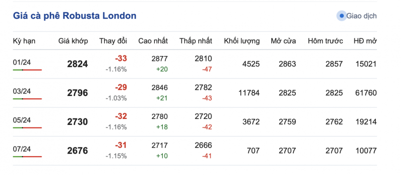 Giá cà phê Robusta trên sàn London ngày 19/12/2023 đảo chiều giảm ở tất cả các kỳ hạn, mức giá dao động từ 2.666 - 2.877 USD/tấn. Cụ thể, kỳ hạn giao hàng tháng 1/2024 là 2.824 USD/tấn (giảm 33 USD/tấn); kỳ hạn giao hàng tháng 3/2024 là 2.796 USD/tấn (giảm 29 USD/tấn); kỳ hạn giao hàng tháng 5/2024 là 2.2.730 USD/tấn và kỳ hạn giao hàng tháng 7/2024 là 2.676 USD/tấn.
