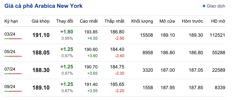 Trong khi đó, ngược lại, giá cà phê Arabica trên sàn New York sáng ngày 19/12 trở lại xu hướng tăng ở các kỳ hạn. Cụ thể, kỳ hạn giao hàng tháng 3/2024 là 191,10 cent/lb (tăng 0,95%); kỳ giao hàng tháng 5/2024 là 188,05 cent/lb (tăng 0,67%); kỳ giao hàng tháng 7/2024 là 188,30 cent/lb (tăng 0,67%) và kỳ giao hàng tháng 9/2024 là 189,10 cent/lb (tăng 0,67%).