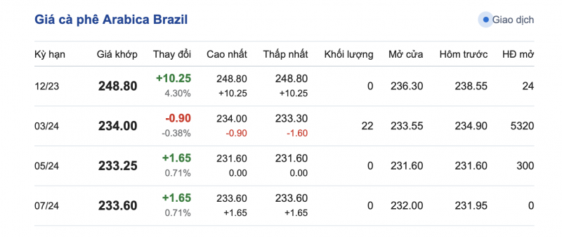Giá cà phê Arabica Brazil ngày 19/12/2023 có xu hướng tăng và giảm tùy kỳ hạn. Cụ thể, kỳ hạn giao hàng tháng 12/2023 là 248.80 USD/tấn; kỳ giao hàng tháng 3/2024 là 234.00 USD/tấn; kỳ giao hàng tháng 5/2024 là 233.25 USD/tấn và giao hàng tháng 7/2024 là 233.60 USD/tấn.