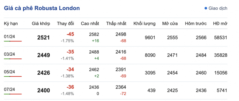Giá cà phê Robusta trên sàn London ngày 20/11/2023 vẫn ở mức giảm, không biến động nhiều so với phiên giao dịch trước đó, dao động từ 2.364 - 2.582 USD/tấn. Cụ thể, kỳ hạn giao hàng tháng 1/2024 là 2.521 USD/tấn; kỳ hạn giao hàng tháng 3/2024 là 2.449 USD/tấn; kỳ hạn giao hàng tháng 5/2024 là 2.426 USD/tấn và kỳ hạn giao hàng tháng 7/2024 là 2.400 USD/tấn.