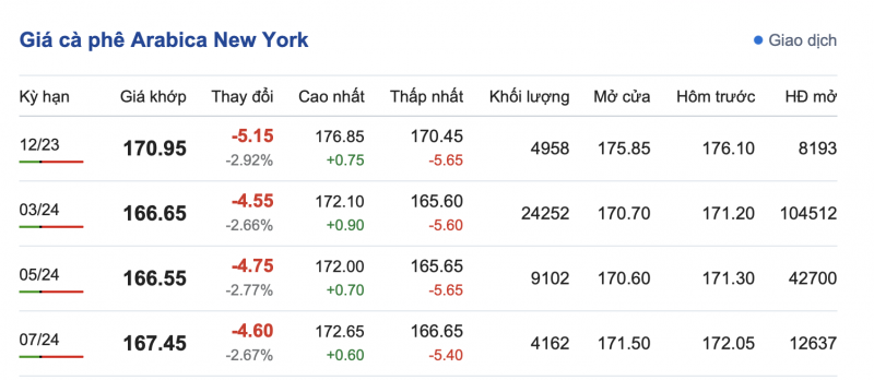 Tương tự, giá cà phê Arabica trên sàn New York sáng ngày 20/11 ổn định, dao động từ 165,60 - 176,85 cent/lb tuỳ từng kỳ hạn giao hàng. Cụ thể, kỳ hạn giao hàng tháng 12/2023 là 170,95 cent/lb; kỳ giao hàng tháng 3/2024 là 166,65 cent/lb; kỳ giao hàng tháng 5/2024 là 166,55 cent/lb và kỳ giao hàng tháng 7/2024 là 167,45 cent/lb.