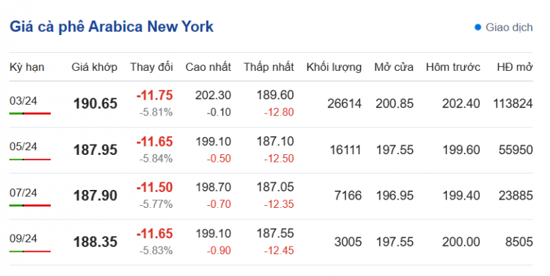 Trong khi đó, giá cà phê Arabica trên sàn New York sáng ngày 21/12 quay đầu giảm ngay đầu phiên giao dịch. Cụ thể, kỳ hạn giao hàng tháng 3/2024 là 190,65 cent/lb (giảm 5,81%%); kỳ giao hàng tháng 5/2024 là 187,95 cent/lb (giảm 5,84%); kỳ giao hàng tháng 7/2024 là 187,90 cent/lb (giảm 5,77%%) và kỳ giao hàng tháng 9/2024 là 188,35 cent/lb (giảm 5,83%).
