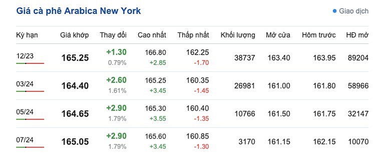 Tương tự, giá cà phê Arabica trên sàn New York sáng ngày 22/10 có xu hướng ổn định và cũng đang đứng ở mức giá khá cao, mức giá dao động từ 160,35 - 166,80 cent/lb tuỳ từng kỳ hạn giao hàng. Cụ thể, kỳ hạn giao hàng tháng 12/2023 là 165,25 cent/lb; kỳ giao hàng tháng 3/2024 là 164,40 cent/lb; kỳ giao hàng tháng 5/2024 là 164,65 cent/lb và kỳ giao hàng tháng 7/2024 là 165,05 cent/lb.