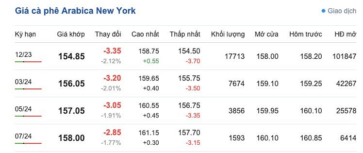 Tương tự cà phê Robusta trên sàn London, giá cà phê Arabica trên sàn New York sáng 22/9 giảm tương đối, mức giảm từ 2,85 - 3,35cent/lb. Cụ thể, kỳ hạn giao hàng tháng 12/2023 là 154,85 cent/lb (giảm 3,35cent/lb), kỳ giao hàng tháng 3/2024 là 156,05 cent/lb (giảm 3,20 cent/lb), kỳ giao hàng tháng 5/2024 là 157,05 cent/lb (giảm 3,05 cent/lb).