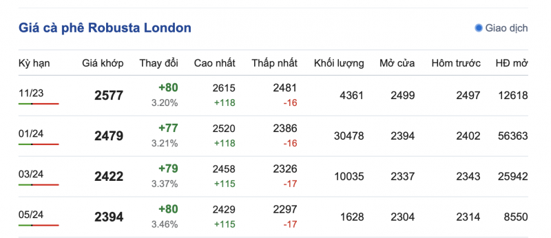 Kết thúc phiên, giá cà phê Robusta trên sàn London ngày 23/10/2023 tiếp tục ổn định và đang ở mức giá cao, dao động từ 2.297 - 2.615 USD/tấn. Cụ thể, kỳ hạn giao hàng tháng 11/2023 là 2.577 USD/tấn; kỳ hạn giao hàng tháng 1/2024 là 2.479 USD/tấn; kỳ hạn giao hàng tháng 3/2024 là 2.422 USD/tấn và kỳ hạn giao hàng tháng 5/2024 là 2.394 USD/tấn.
