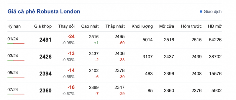 Giá cà phê Robusta trên sàn London ngày 24/11/2023 đảo chiều giảm trở lại, mức giảm tương đối so với phiên giao dịch trước đó từ 13- 50 USD/tấn, dao động từ 2.347 - 2.516 USD/tấn. Cụ thể, kỳ hạn giao hàng tháng 1/2024 là 2.491 USD/tấn (giảm 24 USD/tấn); kỳ hạn giao hàng tháng 3/2024 là 2.426 USD/tấn (giảm 13 USD/tấn); kỳ hạn giao hàng tháng 5/2024 là 2.394 USD/tấn (giảm 14 USD/tấn) và kỳ hạn giao hàng tháng 7/2024 là 2.360 USD/tấn (giảm 16 USD/tấn).