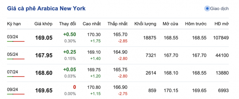 Trong khi đó, giá cà phê Arabica trên sàn New York sáng ngày 24/11 lại có xu hướng tăng nhẹ tại một số thời điểm, dao động từ 164,90 - 170,30 cent/lb tuỳ từng kỳ hạn giao hàng. Cụ thể, kỳ hạn giao hàng tháng 3/2024 là 169,05 cent/lb; kỳ giao hàng tháng 5/2024 là 167,95 cent/lb; kỳ giao hàng tháng 7/2024 là 168,60 cent/lb và kỳ giao hàng tháng 9/2024 là 169,65 cent/lb.