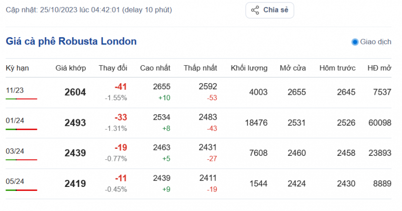 Kết thúc phiên, giá cà phê Robusta trên sàn London ngày 25/10/2023 xu hướng giảm sâu. Mức giảm mạnh từ 11 - 41 USD, dao động từ 2.419 - 2.604 USD/tấn. Cụ thể, kỳ hạn giao tháng 11/2023 giảm 41 USD, còn 2.604 USD/tấn và kỳ hạn giao tháng 1/2024 giảm 33 USD, xuống 2.493 USD/tấn. Khối lượng giao dịch trên mức trung bình.