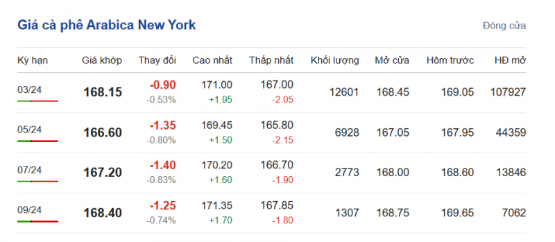 Đối lập, giá cà phê Arabica trên sàn New York sáng ngày 25/11 có xu hướng giảm nhẹ, dao động từ 166,60 - 168,40 cent/lb tuỳ từng kỳ hạn giao hàng. Cụ thể, kỳ hạn giao hàng tháng 3/2024 là 168,15 cent/lb; kỳ giao hàng tháng 5/2024 là 166,60 cent/lb; kỳ giao hàng tháng 7/2024 là 167,20 cent/lb và kỳ giao hàng tháng 9/2024 là 168,40 cent/lb.