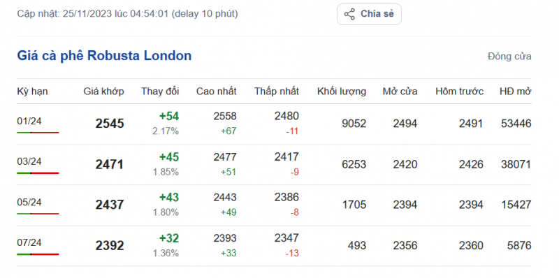 Giá cà phê Robusta trên sàn London ngày 25/11/2023 trở lại mức tăng, từ 32-54 USD/tấn, dao động từ 2.392 - 2.545 USD/tấn. Cụ thể, kỳ hạn giao hàng tháng 1/2024 là 2.545 USD/tấn (tăng 54 USD/tấn); kỳ hạn giao hàng tháng 3/2024 là 2.471 USD/tấn (tăng 45 USD/tấn); kỳ hạn giao hàng tháng 5/2024 là 2.437 USD/tấn (tăng 43 USD/tấn) và kỳ hạn giao hàng tháng 7/2024 là 2.92 USD/tấn (tăng 32 USD/tấn).