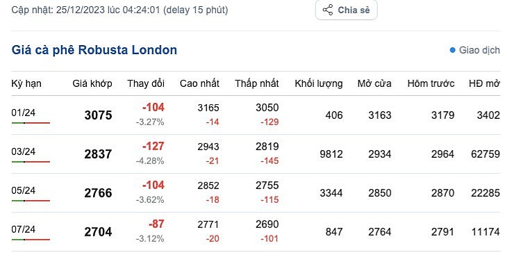 | Giá Arabia và Robusta mới nhất ngày 25/12/2023 |
