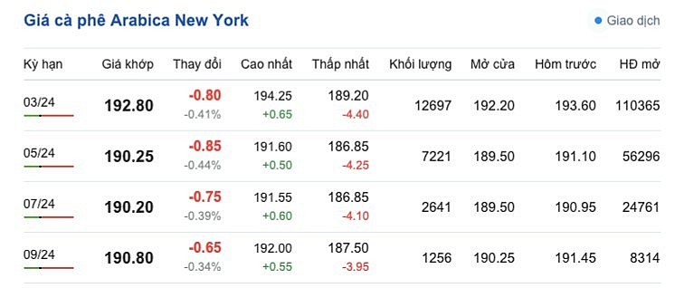 Tương tự, giá cà phê Arabica trên sàn New York sáng ngày 25/12 giữ mức ổn định so với phiên giao dịch trước. Cụ thể, kỳ hạn giao hàng tháng 3/2024 là 192,80 cent/lb; kỳ giao hàng tháng 5/2024 là 190,25 cent/lb; kỳ giao hàng tháng 7/2024 là 190,20 cent/lb và kỳ giao hàng tháng 9/2024 là 190,80 cent/lb.