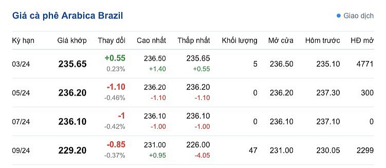Cụ thể, giá cà phê Arabica Brazil ngày 25/12/2023 tiếp tục ổn định. Cụ thể, kỳ hạn giao hàng tháng 3/2024 là 235,65 USD/tấn; kỳ giao hàng tháng 5/2024 là 236,20 USD/tấn; kỳ giao hàng tháng 7/2024 là 236,10 USD/tấn và giao hàng tháng 9/2024 là 229,20 USD/tấn.