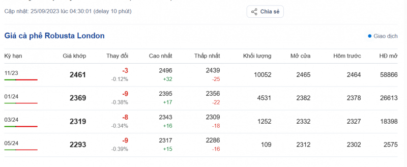 | Giá Arabia và Robusta mới nhất ngày 25/9/2023 |