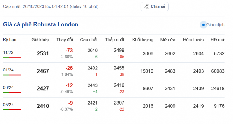 Kết thúc phiên, giá cà phê Robusta trên sàn London ngày 26/10/2023 xu hướng giảm sâu. Mức giảm mạnh từ 9 - 73 USD, dao động từ 2.410 - 2.531 USD/tấn. Cụ thể, kỳ hạn giao tháng 11/2023 giảm 73 USD, còn 2.531 USD/tấn và kỳ hạn giao tháng 1/2024 giảm 26 USD, xuống 2.467 USD/tấn. Khối lượng giao dịch trên mức trung bình.
